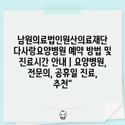 남원의료법인원산의료재단 다사랑요양병원 예약 방법 및 진료시간 공지 | 요양병원, 전연락, 공휴일 진료, 추천” 에 대해 자주 묻는 질문 TOP 5
