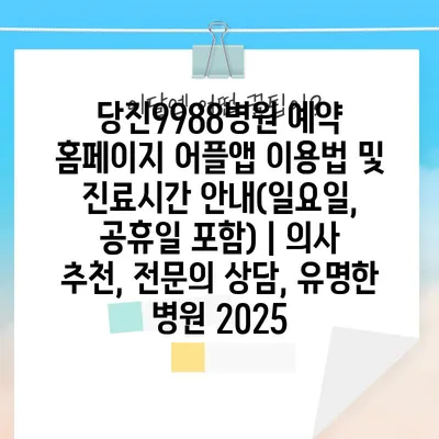 당진9988병원 예약 홈페이지 어플앱 이용법 및 진료시간 공지(일요일, 공휴일 포함) | 의사 추천, 전연락 상담, 유명한 병원 2025에 대해 소개합니다.