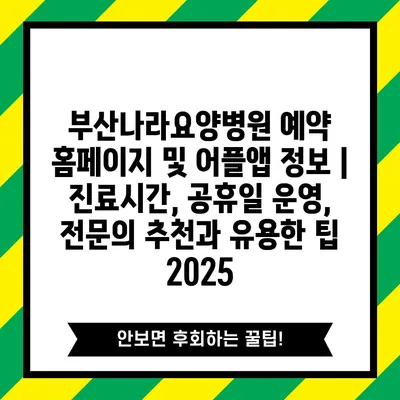 부산나라요양병원 예약 홈페이지 및 어플앱 정보 | 진료시간, 공휴일 운영, 전문의 추천과 유용한 팁 2025