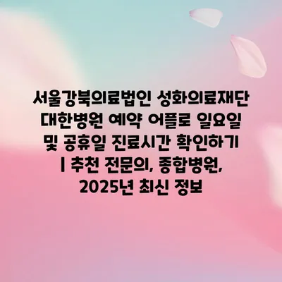 서울강북의료법인 성화의료재단 대한병원 예약 어플로 일요일 및 공휴일 진료시간 확인하기 | 추천 전연락, 종합병원, 2025년 최신 정보 에 대해 자주 묻는 질문 TOP 5