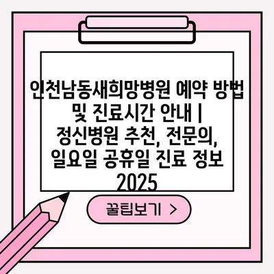 인천남동새희망병원 예약 방법 및 진료시간 공지 | 정신병원 추천, 전연락, 일요일 공휴일 진료 정보 2025 에 대해 자주 묻는 질문 TOP 5