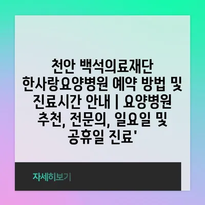 천안 백석의료재단 한사랑요양병원 예약 방법 및 진료시간 공지 | 요양병원 추천, 전연락, 일요일 및 공휴일 진료’ 에 대해 자주 묻는 질문 TOP 5