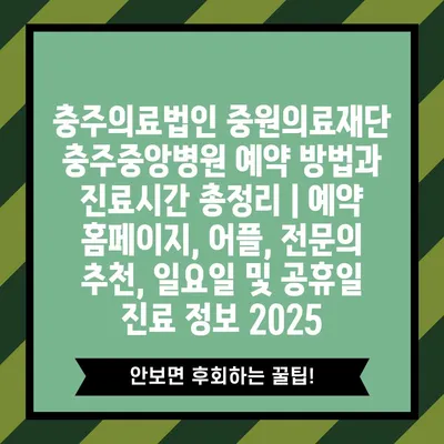 충주의료법인 중원의료재단 충주중앙병원 예약 방법과 진료시간 총정리 | 예약 홈페이지, 어플, 전연락 추천, 일요일 및 공휴일 진료 정보 2025 충주중앙병원은 …