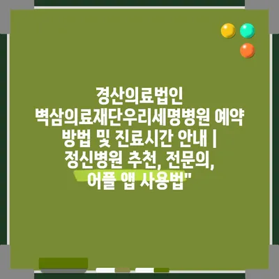 경산의료법인 벽삼의료재단우리세명병원은 정신건강에 대한 전문적인 치료를 제공하는 곳입니다. 예약 방법은 간단하며, 전화 또는 온라인으로 쉽게 할 수 있습니다. 전화 예약 …