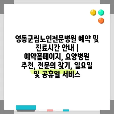 영동군립노인전문병원 예약 및 진료시간 공지 영동군립노인전문병원은 노인 전문 의료 서비스를 제공하는 곳으로, 예약홈페이지를 통해 간편하게 진료 예약을 할 수 있습니다. …