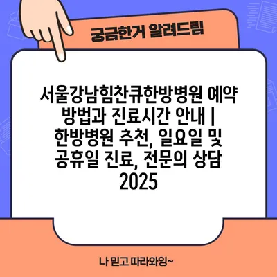 서울강남힘찬큐한방병원 예약 방법과 진료시간 공지 | 한방병원 추천, 일요일 및 공휴일 진료, 전연락 상담 2025에 대한 내용을 제공하겠습니다. 서울강남힘찬큐한방병원에서는 온라인 …