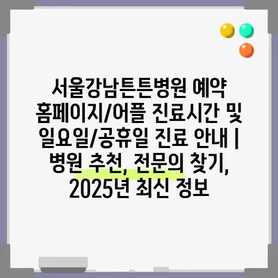 서울강남튼튼병원 예약 홈페이지 및 어플에서는 진료시간을 손쉽게 확인할 수 있습니다. 특히, 일요일 및 공휴일의 진료 여부에 대한 정보는 환자분들에게 매우 …