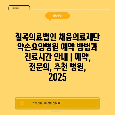 칠곡의료법인 채움의료재단 약손요양병원 예약 방법과 진료시간 공지 약손요양병원은 전문적인 의료 서비스를 제공하는 병원으로, 환자분들의 편의를 위해 간편한 예약 시스템을 운영하고 …
